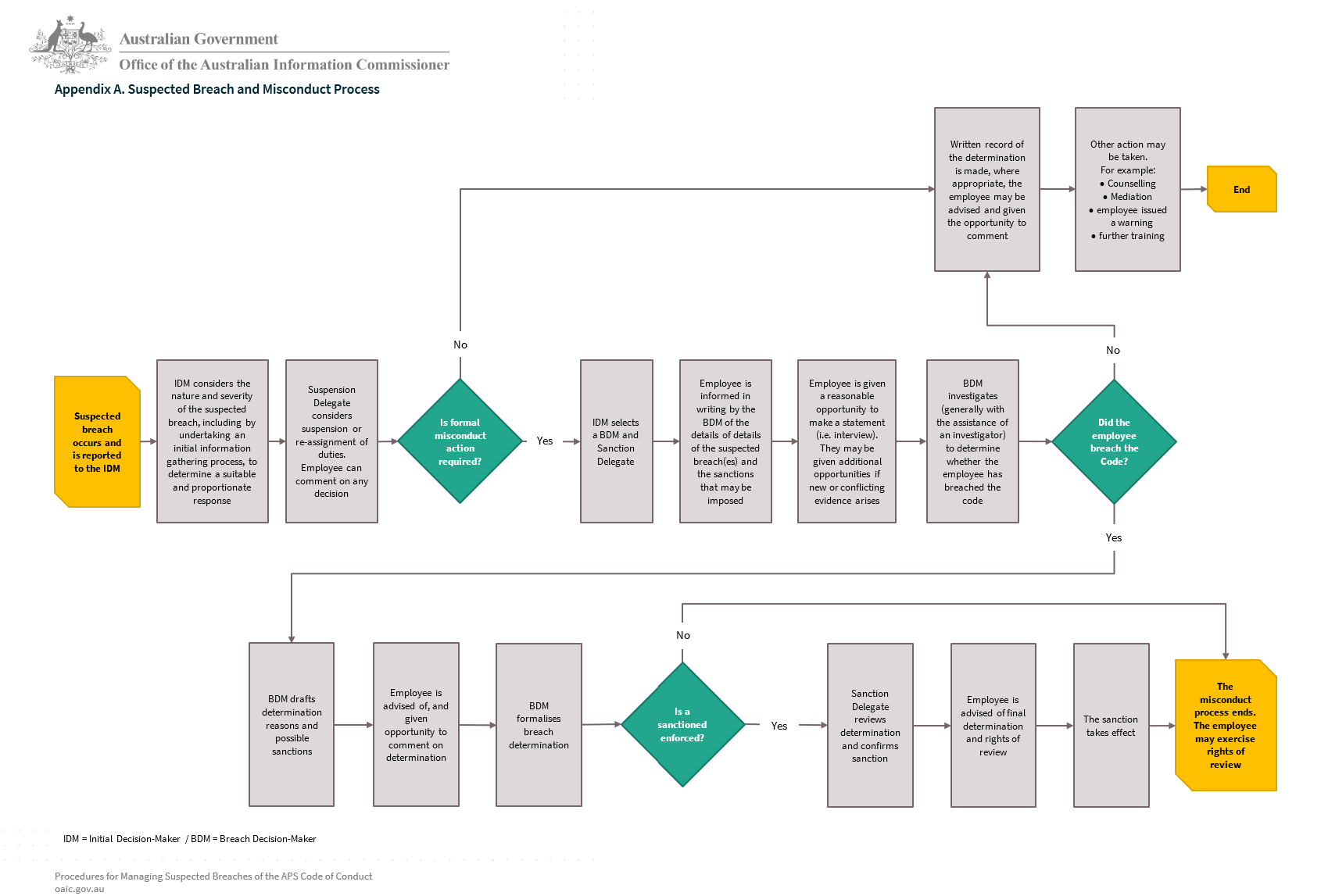 12 In performing their role, the Initial Decision-Maker should have regard to any relevant standards and guidance issued by the Australian Public Service Commissioner, including the Handling misconduct: a human resource manager’s guide - external site published by the Australian Public Service Commissioner (APSC). The Initial Decision-Maker should consider Chapter 4. When behaviour doesn’t meet expectations: preliminary decisions in the guide when dealing with conduct that may relate to both a suspected breach of the Code and a circumstance where the employee may not be demonstrating effective performance.